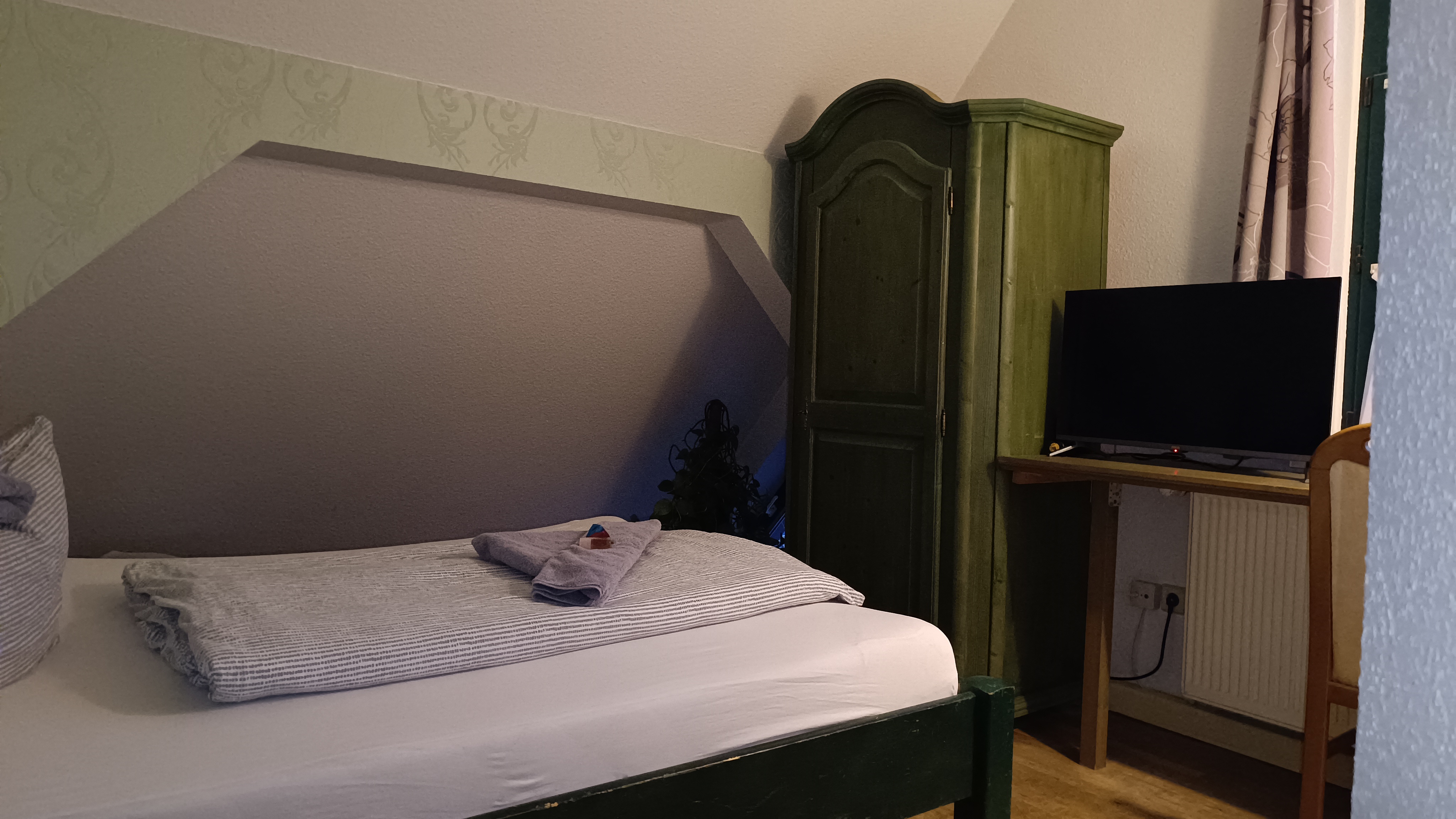 Unser Einzelzimmer verfügt über ein kleines Doppelbett ( 1,40m x 2,00m ) und kann somit als günstigere Alternative auch als "Mini-Doppelzimmer" mit 2 Personen genutzt werden. Im Vergleich zu unseren Standard-Doppelzimmern ist dieses Zimmer aber wesentlich kleiner.